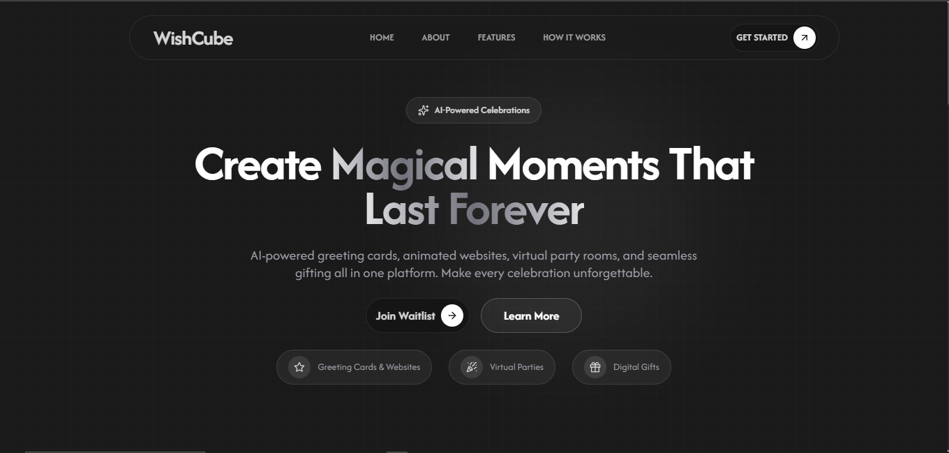 WishCube is an AI-powered celebration platform that lets you create personalized animated greeting cards, host virtual party rooms, and send integrated digital gifts — all in one place. Features include voice message narration, confetti animations, RSVP tracking, and multi-channel sharing via WhatsApp, Instagram, and email.
